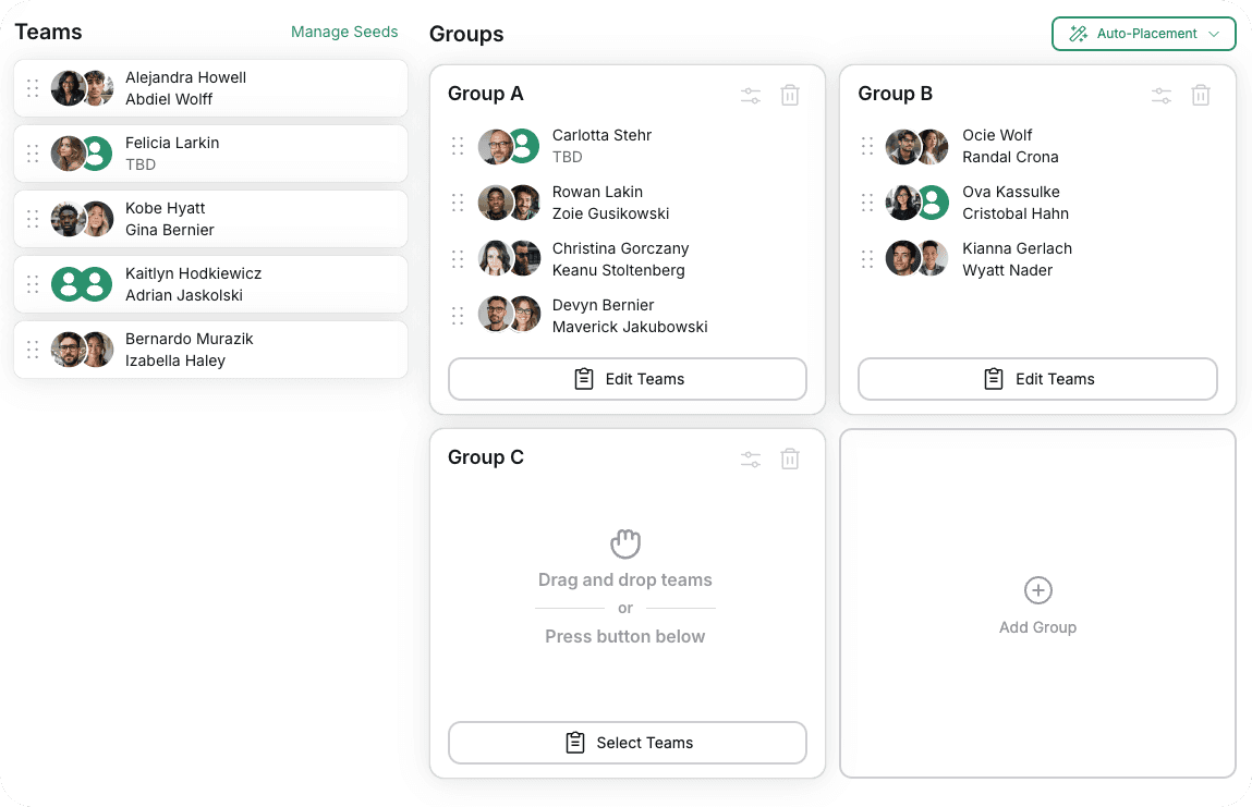 Teams, singles, doubles? Ai handles it for you with pairing, groups, brackets, random matchups, ladder format.